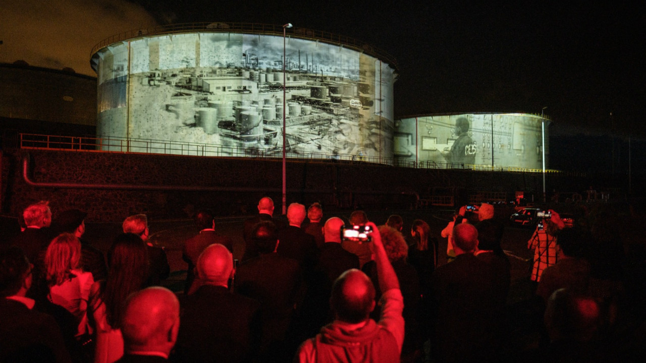 En el inicio del proceso de desmantelamiento de la refinería petrolera se proyectó un videomapping sobre la superficie de dos enormes tanques de petróleo de las instalaciones.